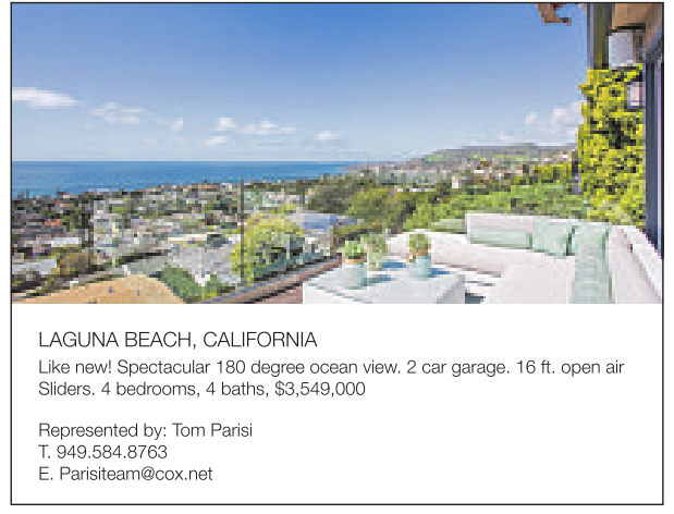LAGUNA BEACH, CALIFORNIA Like new! Spectacular 180 degree ocean view. 2car garage. 16 ft. open air Sliders. 4bedrooms, 4baths, $3,549,000
