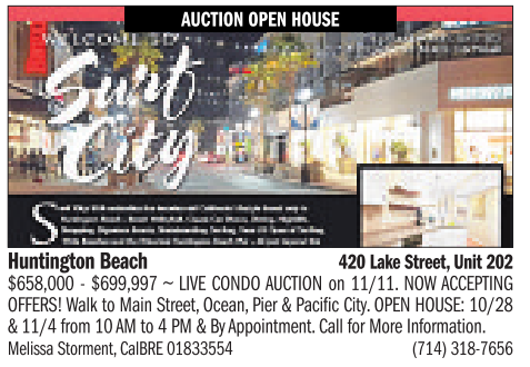 AUCTION OPEN HOUSE Huntington Beach 420LakeStreet, Unit 202 $658,000 -$699,997 ~LIVE CONDO AUCTION on 11/11. NOW ACCEPTING OFFERS! Walk to Main Street, Ocean, Pier &PacificCity.OPEN HOUSE: 10/28 &11/4 from 10 AM to 4PM&ByAppointment. Call for More Information. Melissa Storment, CalBRE 01833554 (714) 318-7656