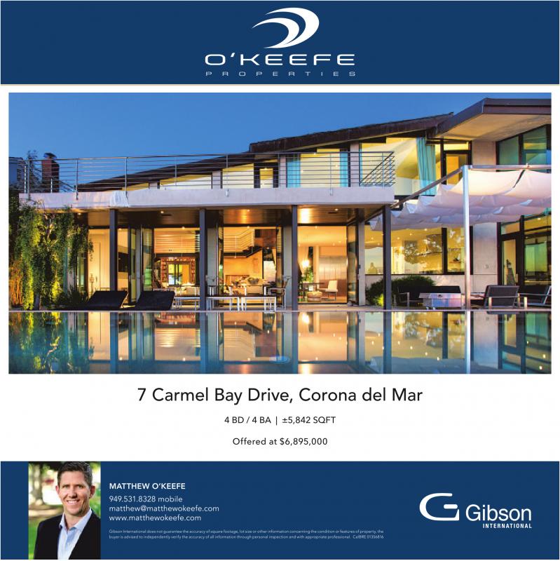 7 Carmel Bay Drive, Corona del Mar 4 BD / 4 BA | ±5,842 SQFT Offered at $6,895,000 MATTHEW O’KEEFE 949.531.8328 mobile matthew@matthewokeefe.com www.matthewokeefe.com Gibson International does notguarantee theaccuracyofsquare footage, lotsizeorother information concerningthe conditionorfeatures of property,the buyer isadvised to independently verify the accuracy ofall information through personal inspection and with appropriate professional. CalBRE 01356816
