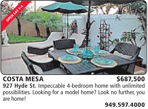 COSTA MESA $687,500 927 Hyde St. Impeccable 4-bedroom home with unlimited possibilities.Looking for amodel home? Look no further,you are home!