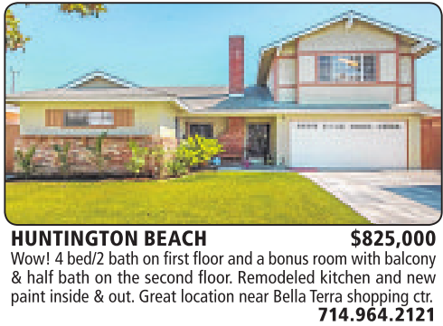 HUNTINGTON BEACH $825,000 Wow! 4bed/2 bath on first floor and abonus room with balcony &half bath on the second floor.Remodeled kitchen and new paint inside &out. Great location near Bella Terra shopping ctr.