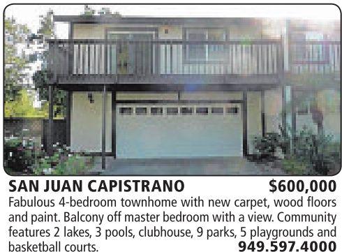 SAN JUAN CAPISTRANO $600,000 Fabulous 4-bedroom townhome with new carpet, wood floors andpaint. Balcony offmasterbedroom with aview.Community features 2lakes,3pools,clubhouse,9parks,5playgrounds and basketball courts. 949.597.4000