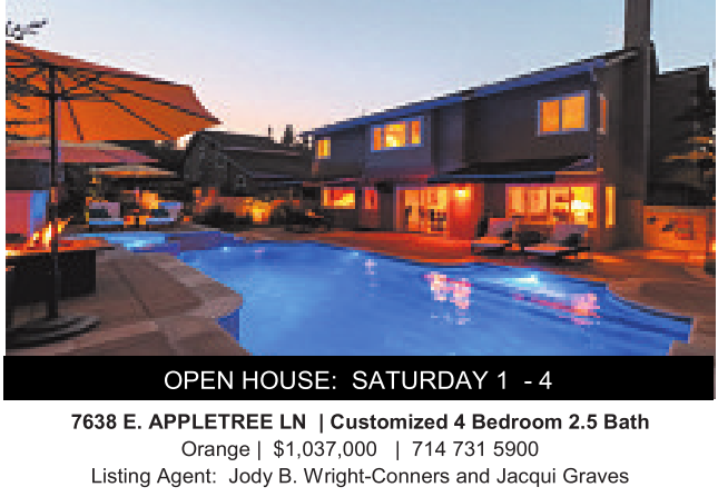 OPEN HOUSE: SATURDAY 1 - 4 7638 E.APPLETREE LN |Customized 4Bedroom 2.5 Bath Orange | $1,037,000 | 714 731 5900 Listing Agent: Jody B.Wright-Conners and Jacqui Graves