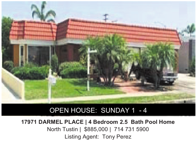 17971 DARMEL PLACE |4Bedroom 2.5 Bath Pool Home North Tustin | $885,000 | 714 731 5900 Listing Agent: Tony Perez