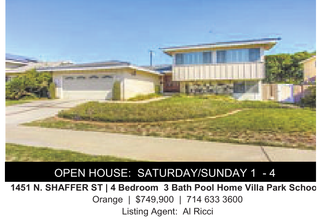 OPEN HOUSE: SATURDAY/SUNDAY 1 - 4 1451 N.SHAFFER ST |4Bedroom 3Bath Pool Home Villa Park Schoo Orange | $749,900 | 714 633 3600 Listing Agent: AlRicci
