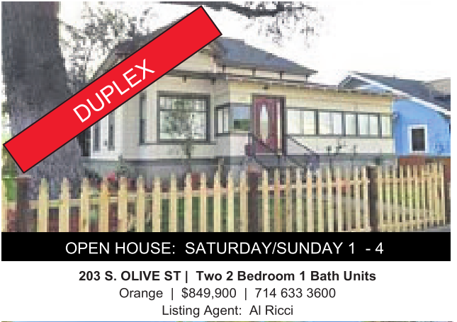 OPEN HOUSE: SATURDAY/SUNDAY 1 - 4 203 S. OLIVE ST| Two 2Bedroom 1Bath Units Orange | $849,900 | 714 633 3600 Listing Agent: AlRicci