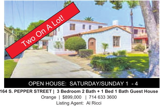 OPEN HOUSE: SATURDAY/SUNDAY 1 - 4 164 S. PEPPER STREET | 3 Bedroom 2Bath +1Bed 1Bath Guest House Orange | $899,000 | 714 633 3600 Listing Agent: AlRicci