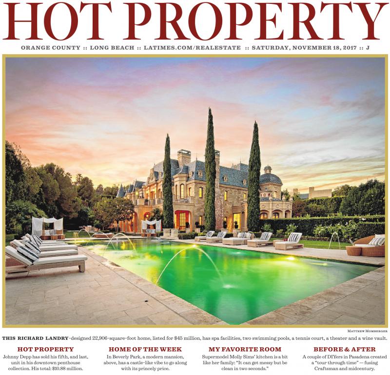 HOT PROPERT Y ORANGE COUNTY :: LONG BEACH :: LATIMES.COM/REALESTATE :: SATURDAY, NOVEMBER 18, 2017 :: J Matthew Momberger THIS RICHARD LANDRY-designed 22,906-square-foot home, listed for $45 million, has spa facilities, two swimming pools, a tennis court, a theater and a wine vault. HOT PROPERTY Johnny Depp has sold his fifth, and last, unit in his downtown penthouse collection. His total: $10.88 million. HOME OF THE WEEK In Beverly Park, a modern mansion, above, has a castle-like vibe to go along with its princely price. MY FAVORITE ROOM Supermodel Molly Sims’ kitchen is a bit like her family: “It can get messy but be clean in two seconds.” BEFORE & AFTER A couple of DIYers in Pasadena created a “tour through time” — fusing Craftsman and midcentury.