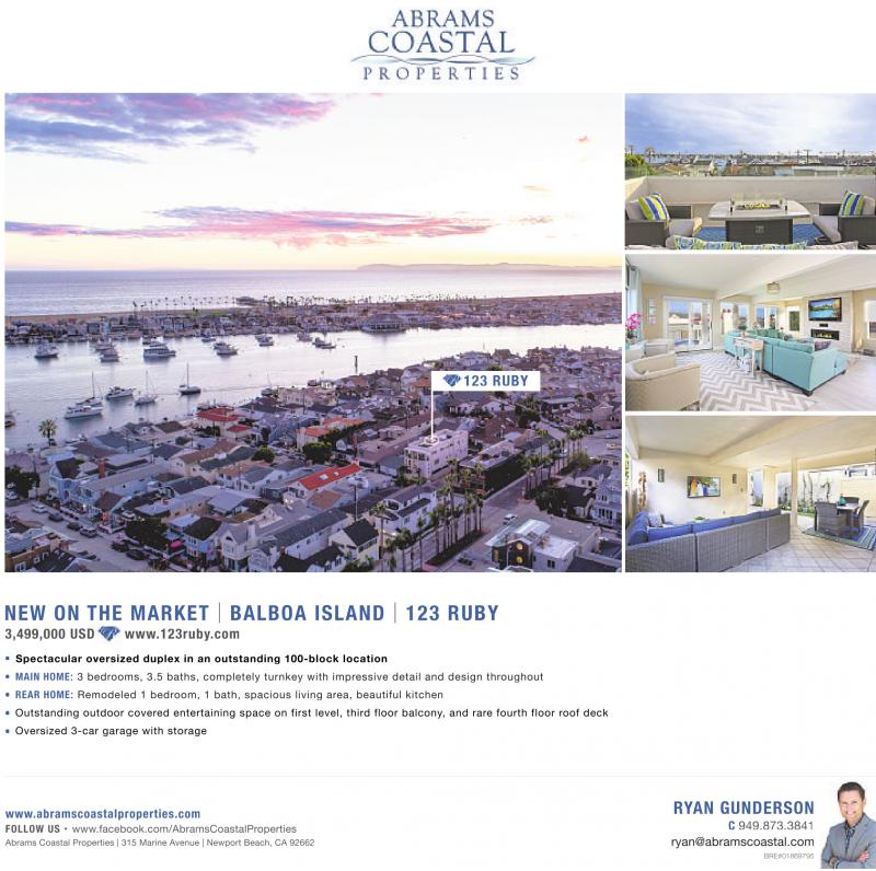 123 RUBY NEW ON THE MARKET | BALBOA ISLAND | 123 RUBY 3,499,000 USD www.123ruby.com Spectacular oversized duplex in an outstanding 100-block location MAIN HOME: 3 bedrooms, 3.5 baths, completely turnkey with impressive detail and design throughout REAR HOME: Remodeled 1 bedroom, 1 bath, spacious living area, beautiful kitchen Outstanding outdoor covered entertaining space on first level, third floor balcony, and rare fourth floor roof deck Oversized 3-car garage with storage www.abramscoastalproperties.com FOLLOW US • www.facebook.com/AbramsCoastalProperties Abrams Coastal Properties | 315 Marine Avenue | Newport Beach, CA 92662 RYAN GUNDERSON C 949.873.3841 ryan@abramscoastal.com BRE#01869795