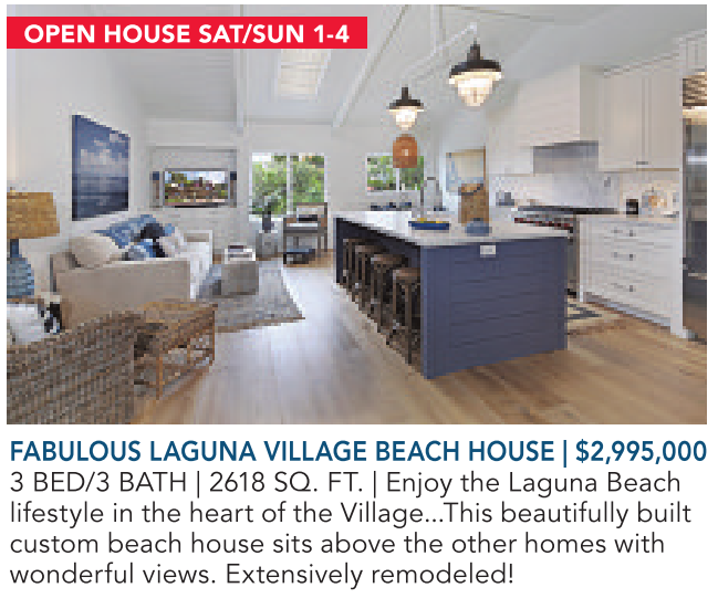 OPEN HOUSE SAT/SUN 1-4 FABULOUS LAGUNA VILLAGE BEACH HOUSE | $2,995,000 3 BED/3 BATH | 2618 SQ. FT. | Enjoy the Laguna Beach lifestyle in the heart of the Village...This beautifully built custom beach house sits above the other homes with wonderful views. Extensively remodeled! See also