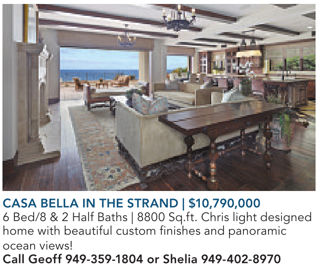 CASA BELLA IN THE STRAND | $10,790,000 6 Bed/8 & 2 Half Baths | 8800 Sq.ft. Chris light designed home with beautiful custom finishes and panoramic ocean views! Call Geoff 949-359-1804 or Shelia 949-402-8970