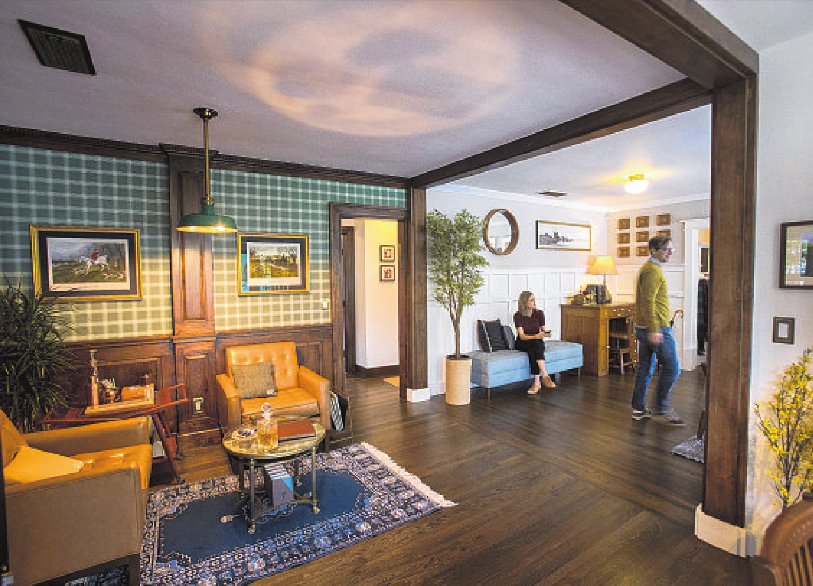 The lounge, modeled after an English pub, is draped in forestgreen and beige plaid wallpaper by Astek, custom-milled Alder arches and wainscoting, and a $1,200 leather-tufted door designed by Lanzetti Upholstery and inspired by James Bond.