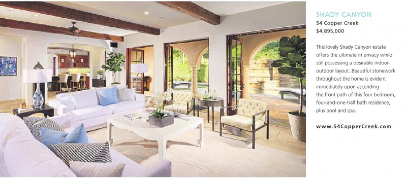 SHADY CANYON 54 Copper Creek $4,895,000 This lovely Shady Canyon estate offers the ultimate in privacy while still possessing a desirable indooroutdoor layout. Beautiful stonework throughout the home is evident immediately upon ascending the front path of this four bedroom, four-and-one-half bath residence, plus pool and spa. www.54CopperCreek.com