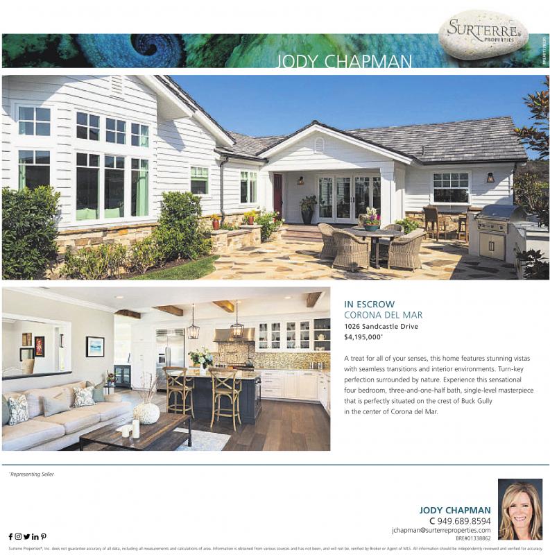 JODY CHAPMAN IN ESCROW CORONA DEL MAR 1026 Sandcastle Drive $4,195,000 * A treat for all of your senses, this home features stunning vistas with seamless transitions and interior environments. Turn-key perfection surrounded by nature. Experience this sensational four bedroom, three-and-one-half bath, single-level masterpiece that is perfectly situated on the crest of Buck Gully in the center of Corona del Mar. * Representing Seller JODY CHAPMAN C 949.689.8594 jchapman@surterreproperties.com BRE#01338862 Surterre Properties ® ,Inc. does not guarantee accuracy of all data, including all measurements and calculations ofarea. Information is obtained from various sources and has not been, and will not be, verified by Broker or Agent ofMLS. All information should be independently reviewed and verified for accuracy. See also