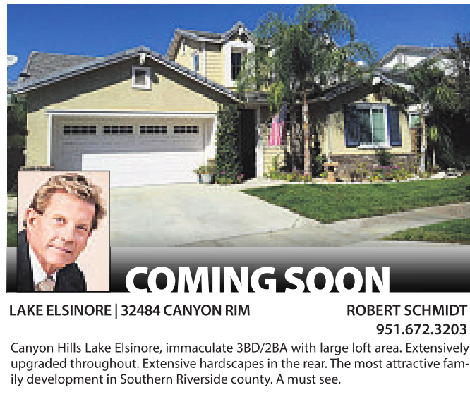 COMING SOON LAKE ELSINORE |32484 CANYON RIM CanyonHillsLakeElsinore, immaculate3BD/2BA with large loftarea. Extensively upgraded throughout. Extensivehardscapes in the rear.The most attractivefamilydevelopment in Southern Riverside county. Amust see. ROBERT SCHMIDT 951.672.3203