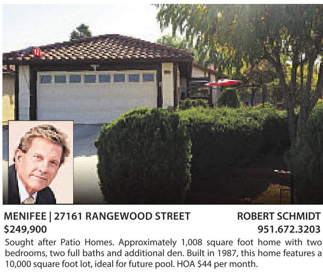 MENIFEE |27161 RANGEWOOD STREET $249,900 951.672.3203 Sought after Patio Homes. Approximately 1,008 square foot home with two bedrooms, two full baths and additional den. Built in 1987, this home features a 10,000 squarefoot lot, ideal forfuturepool. HOA$44 per month. ROBERT SCHMIDT