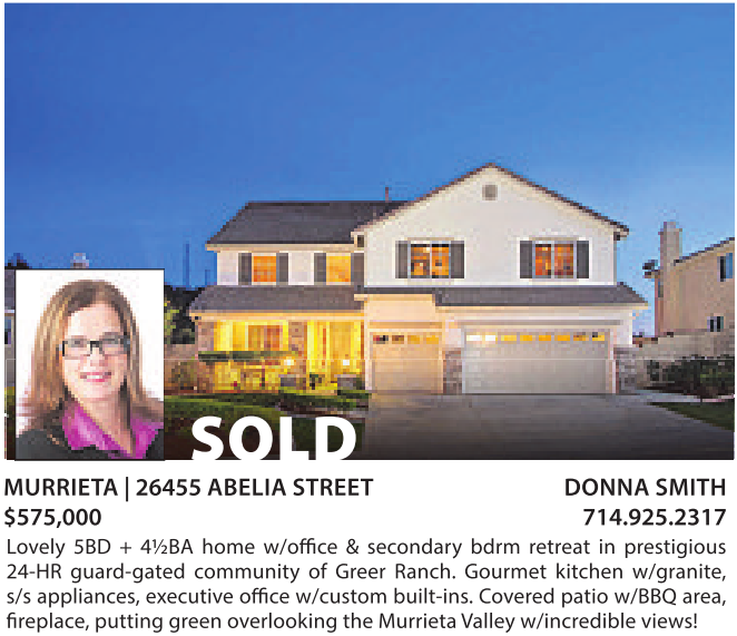 SOLD MURRIETA |26455 ABELIA STREET DONNA SMITH $575,000 714.925.2317 Lovely 5BD + 4½BA home w/office & secondary bdrm retreat in prestigious 24-HR guard-gated community of Greer Ranch. Gourmet kitchen w/granite, s/s appliances, executive office w/custom built-ins. Covered patio w/BBQ area, fireplace, puttinggreen overlookingthe Murrieta Valley w/incredible views!