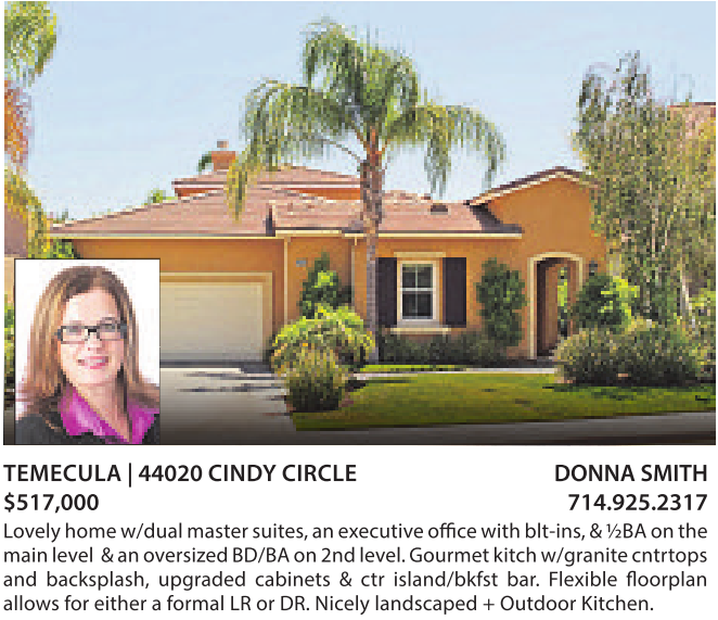 TEMECULA |44020 CINDYCIRCLE DONNA SMITH $517,000 714.925.2317 Lovely home w/dual master suites,anexecutive office withblt-ins,&½BA on the main level &anoversized BD/BA on 2nd level.Gourmet kitchw/granitecntrtops and backsplash, upgraded cabinets & ctr island/bkfst bar. Flexible floorplan allows foreither aformal LR or DR. Nicely landscaped +Outdoor Kitchen.