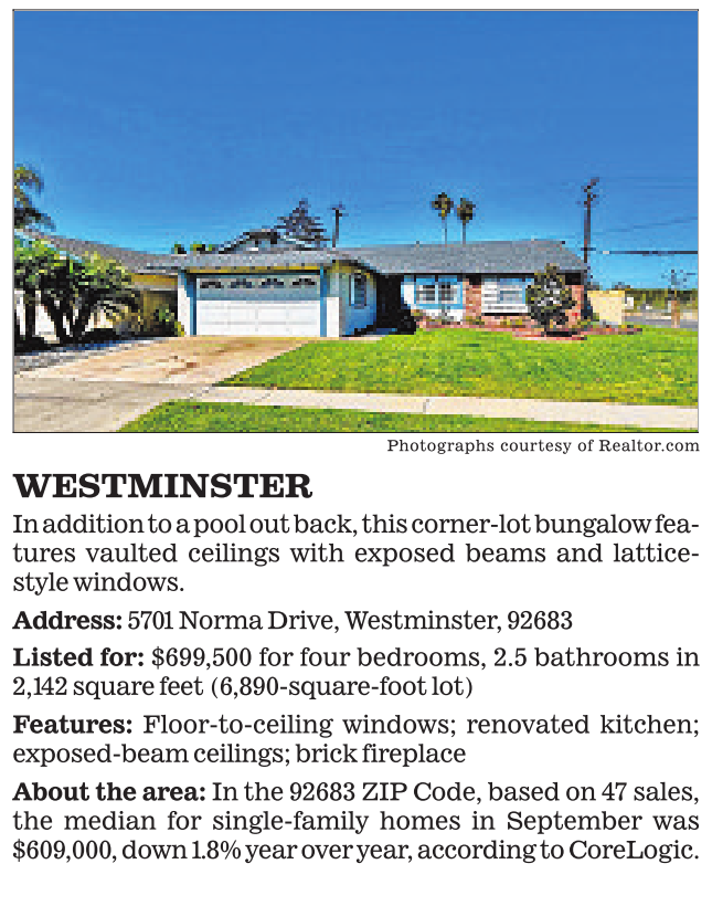Photographs courtesy of Realtor.com WESTMINSTER In addition to a pool out back, this corner-lot bungalow features vaulted ceilings with exposed beams and latticestyle windows. Address: 5701 Norma Drive, Westminster, 92683 Listed for: $699,500 for four bedrooms, 2.5 bathrooms in 2,142 square feet (6,890-square-foot lot) Features: Floor-to-ceiling windows; renovated kitchen; exposed-beam ceilings; brick fireplace About the area: In the 92683 ZIP Code, based on 47 sales, the median for single-family homes in September was $609,000, down1.8% year over year, according to CoreLogic.