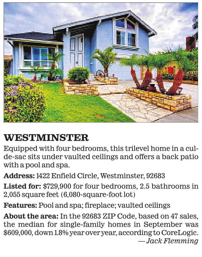 WESTMINSTER Equipped with four bedrooms, this trilevel home in a culde-sac sits under vaulted ceilings and offers a back patio with a pool and spa. Address: 1422 Enfield Circle, Westminster, 92683 Listed for: $729,900 for four bedrooms, 2.5 bathrooms in 2,055 square feet (6,080-square-foot lot) Features: Pool and spa; fireplace; vaulted ceilings About the area: In the 92683 ZIP Code, based on 47 sales, the median for single-family homes in September was $609,000, down1.8% year over year, according to CoreLogic. —Jack Flemming