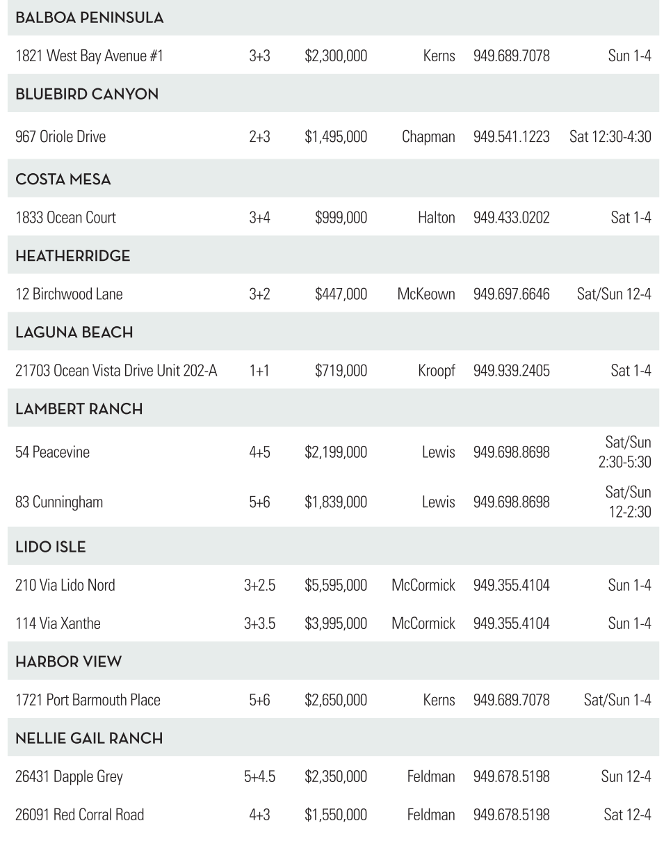 BALBOAPENINSULA 1821 West Bay Avenue #1 3+3 $2,300,000 Kerns 949.689.7078 Sun 1-4 BLUEBIRD CANYON 967 Oriole Drive 2+3 $1,495,000 Chapman 949.541.1223 Sat 12:30-4:30