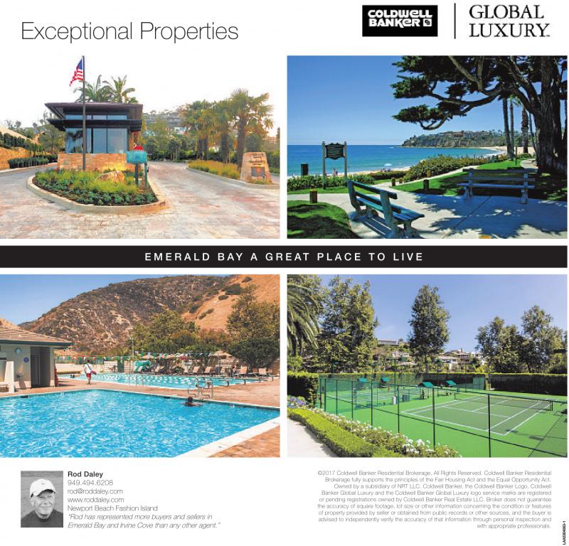Exceptional Properties E M E R A L D B A Y A G R E A T P L A C E T O L I V E Rod Daley 949.494.6208 rod@roddaley.com www.roddaley.com Newport Beach Fashion Island “Rod has represented more buyers and sellers in Emerald Bay and Irvine Cove than any other agent.” ©2017 Coldwell Banker Residential Brokerage. All Rights Reserved. Coldwell Banker Residential Brokerage fully supports the principles of the Fair Housing Act and the Equal Opportunity Act. Owned by a subsidiary of NRT LLC. Coldwell Banker, the Coldwell Banker Logo, Coldwell Banker Global Luxury and the Coldwell Banker Global Luxury logo service marks are registered or pending registrations owned by Coldwell Banker Real Estate LLC. Broker does not guarantee the accuracy of square footage, lot size or other information concerning the condition or features of property provided by seller or obtained from public records or other sources, and the buyer is advised to independently verify the accuracy of that information through personal inspection and with appropriate professionals.