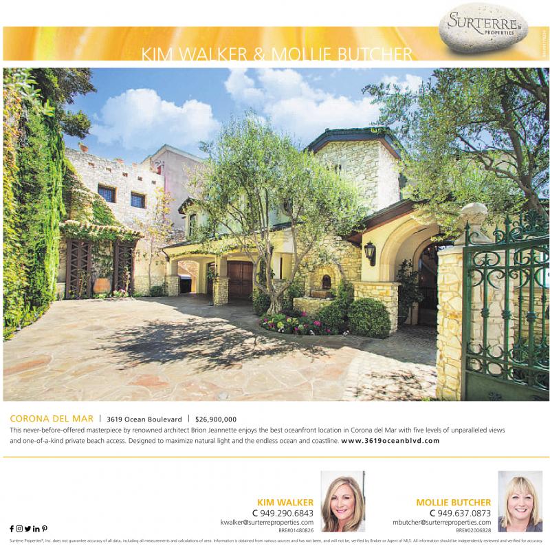 KIM WALKER & MOLLIE BUTCHER CORONA DEL MAR | 3619 Ocean Boulevard | $26,900,000 This never-before-offered masterpiece by renowned architect Brion Jeannette enjoys the best oceanfront location in Corona del Mar with five levels of unparalleled views and one-of-a-kind private beach access. Designed to maximize natural light and the endless ocean and coastline. www.3619oceanblvd.com KIM WALKER C 949.290.6843 kwalker@surterreproperties.com BRE#01480826 MOLLIE BUTCHER C 949.637.0873 mbutcher@surterreproperties.com BRE#02006828 Surterre Properties ® ,Inc. does not guarantee accuracy of all data, including all measurements and calculations ofarea. Information is obtained from various sources and has not been, and will not be, verified by Broker or Agent ofMLS. All information should be independently reviewed and verified for accuracy. See also