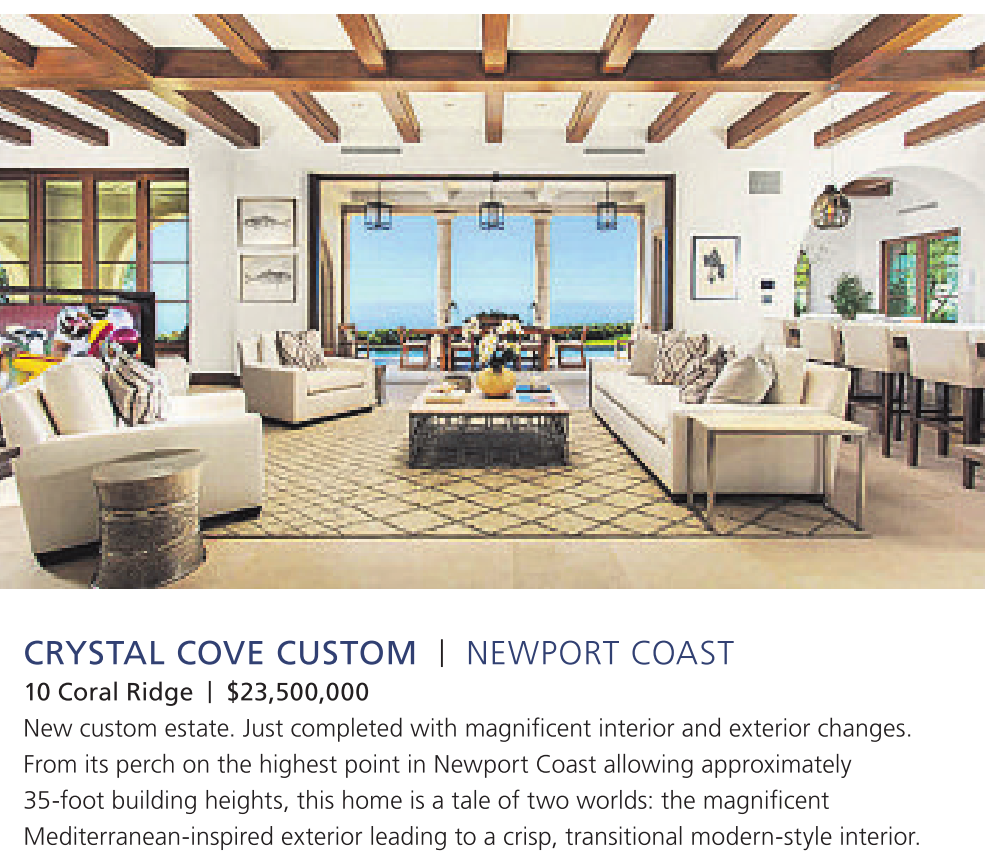CRYSTAL COVE CUSTOM | NEWPORT COAST 10 Coral Ridge | $23,500,000 New custom estate. Just completed with magnificent interior and exterior changes. From its perch on the highest point in Newport Coast allowing approximately 35-foot building heights, this home is a tale of two worlds: the magnificent Mediterranean-inspired exterior leading to a crisp, transitional modern-style interior.