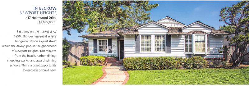IN ESCROW NEWPORT HEIGHTS 417 Holmwood Drive $1,695,000 ** First time on the market since 1950. This quintessential artist’s bungalow sits on a quiet street within the always popular neighborhood of Newport Heights. Just minutes from the beach, harbor, dining, shopping, parks, and award-winning schools. This is a great opportunity to renovate or build new.