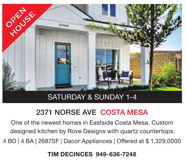 SATURDAY & SUNDAY 1-4 2371 NORSE AVE COSTA MESA One ofthe newest homes inEastside Costa Mesa. Custom designed kitchen by Rove Designs with quartz countertops. 4BD|4BA|2687SF |Dacor Appliances |Offered at $1,329,0000 TIM DECINCES 949-636-7248 See also