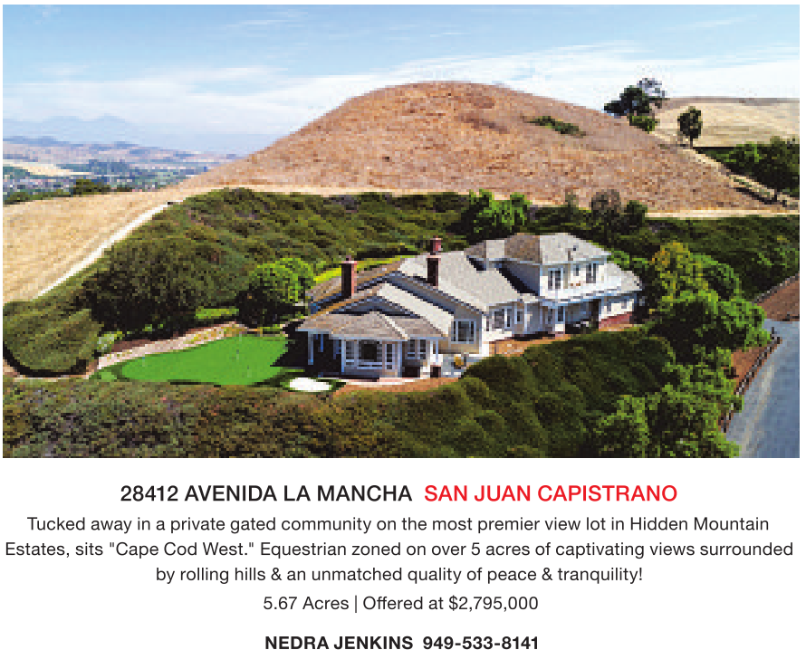 28412 AVENIDA LA MANCHA SAN JUAN CAPISTRANO Tucked away in aprivate gated community on the most premier view lot in Hidden Mountain Estates, sits "Cape Cod West." Equestrian zoned onover 5acres ofcaptivating views surrounded by rolling hills &anunmatched quality of peace &tranquility!