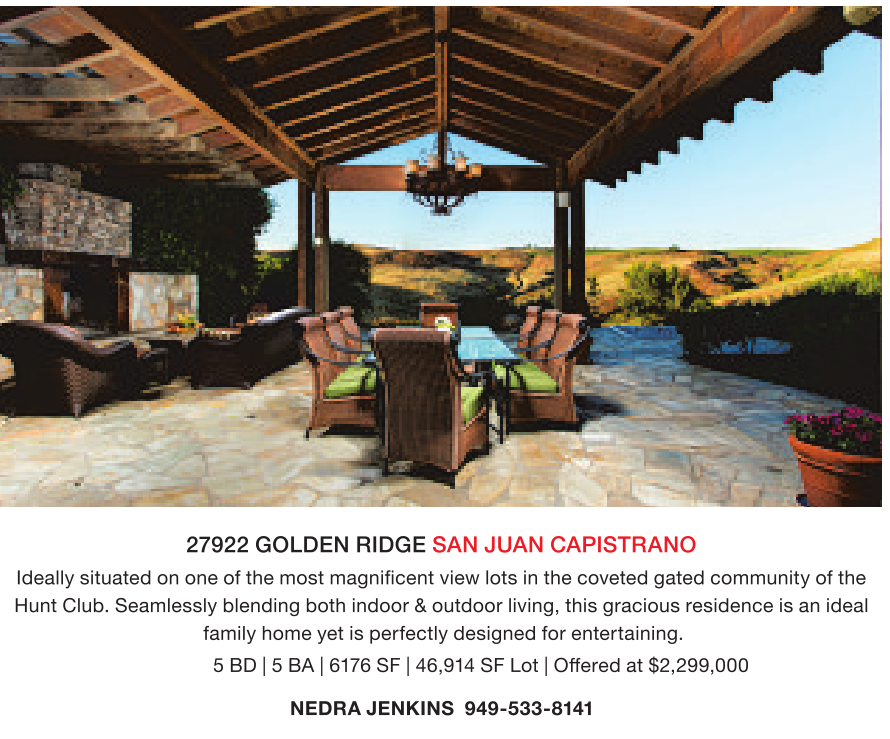 27922 GOLDEN RIDGE SAN JUAN CAPISTRANO Ideally situated on one ofthe most magnificent view lots in the coveted gated community ofthe Hunt Club. Seamlessly blending both indoor &outdoor living, this gracious residence is an ideal family home yet is perfectly designed for entertaining.