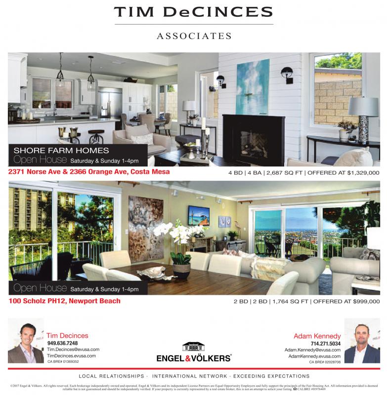 T IM D e C INC E S A S S O C I AT E S SHORE FARM HOMES Open House Saturday & Sunday 1-4pm 2371 Norse Ave & 2366 Orange Ave, Costa Mesa 4 BD | 4 BA | 2,687 SQ FT | OFFERED AT $1,329,000 Open House Saturday & Sunday 1-4pm 100 Scholz PH12, Newport Beach 2 BD | 2 BD | 1,764 SQ FT | OFFERED AT $999,000 Tim Decinces 949.636.7248 Tim.Decinces@evusa.com TimDecinces.evusa.com CA BRE# 01369352 Adam Kennedy 714.271.5034 Adam.Kennedy@evusa.com AdamKennedy.evusa.com CA BRE# 02028706 LOCAL RELATIONSHIPS · INTERNATIONAL NETWORK · EXCEEDING EXPECTATIONS ©2017 Engel &Völkers.All rights reserved.Each brokerage independently owned and operated. Engel&Völkers and its independent License Partners are Equal Opportunity Employers and fully support the principals of the Fair Housing Act. Allinformation provided is deemed reliable but is not guaranteed andshouldbeindependently verified. If your property is currentlyrepresented by areal estate broker, this isnot an attempt to solicityourlisting. CALBRE #01976469