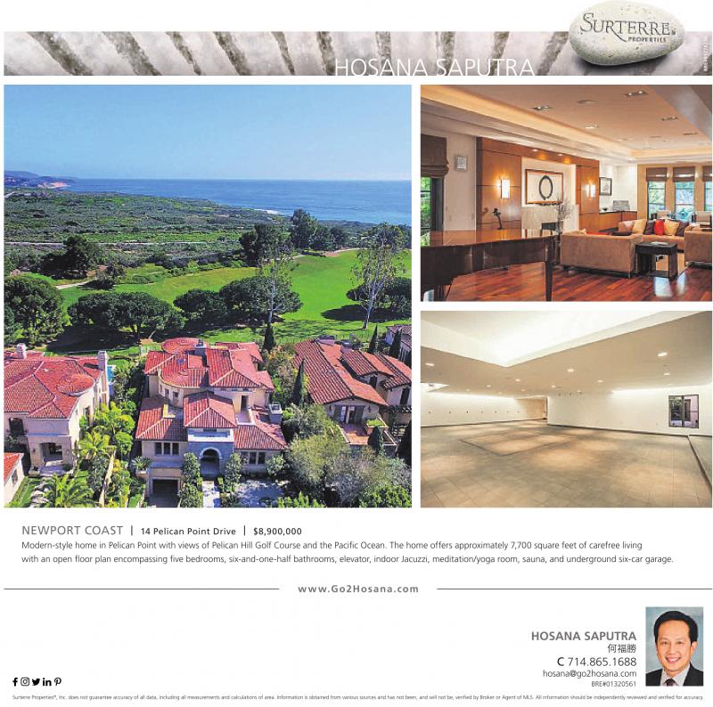 HOSANA SAPUTRA NEWPORT COAST | 14 Pelican Point Drive | $8,900,000 Modern-style home in Pelican Point with views of Pelican Hill Golf Course and the Pacific Ocean. The home offers approximately 7,700 square feet of carefree living with an open floor plan encompassing five bedrooms, six-and-one-half bathrooms, elevator, indoor Jacuzzi, meditation/yoga room, sauna, and underground six-car garage. www.Go2Hosana.com HOSANA SAPUTRA C 714.865.1688 hosana@go2hosana.com BRE#01320561 Surterre Properties ® ,Inc. does not guarantee accuracy of all data, including all measurements and calculations ofarea. Information is obtained from various sources and has not been, and will not be, verified by Broker or Agent ofMLS. All information should be independently reviewed and verified for accuracy.