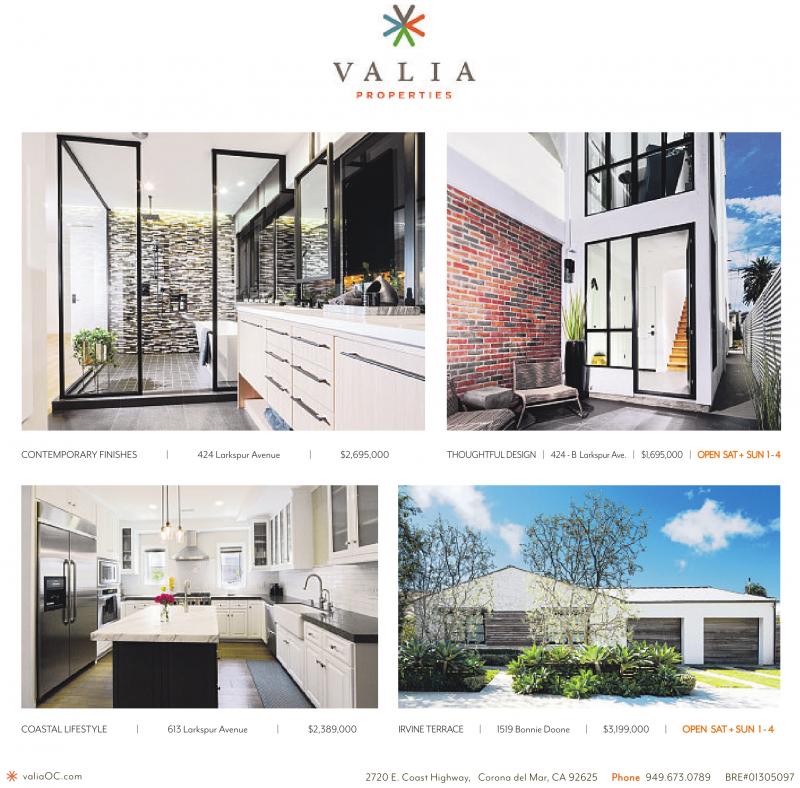 CONTEMPORARYFINISHES | 424Larkspur Avenue | $2,695,000 THOUGHTFUL DESIGN | 424 -B Larkspur Ave. | $1,695,000 | OPEN SAT+ SUN 1-4 COASTALLIFESTYLE | 613Larkspur Avenue | $2,389,000 IRVINE TERRACE | 1519 Bonnie Doone | $3,199,000 | OPEN SAT+SUN 1-4 valiaOC.com 2720 E. Coast Highway, Corona del Mar, CA 92625 Phone 949.673.0789 BRE#01305097