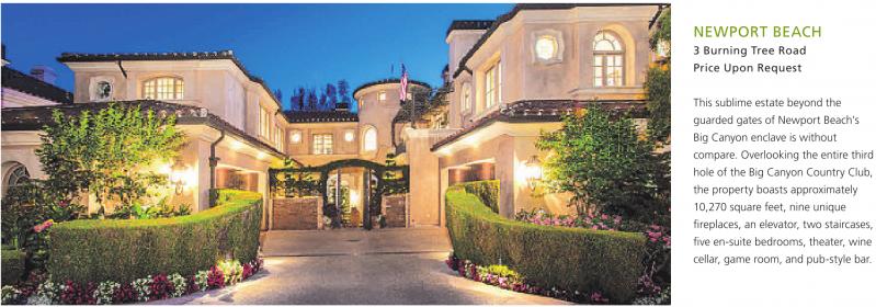 NEWPORT BEACH 3 Burning Tree Road Price Upon Request This sublime estate beyond the guarded gates of Newport Beach’s Big Canyon enclave is without compare. Overlooking the entire third hole of the Big Canyon Country Club, the property boasts approximately 10,270 square feet, nine unique fireplaces, an elevator, two staircases, five en-suite bedrooms, theater, wine cellar, game room, and pub-style bar. See also