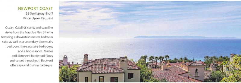 NEWPORT COAST 26 Surfspray Bluff Price Upon Request Ocean, Catalina Island, and coastline views from this Nautilus Plan 3 home featuring a downstairs master bedroom suite as well as a secondary downstairs bedroom, three upstairs bedrooms, and a bonus room. Marble and distressed hardwood floors and carpet throughout. Backyard offers spa and built-in barbeque. See also