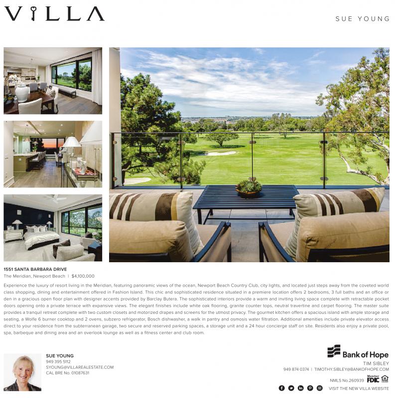 S U E Y O U N G 1551 SANTA BARBARA DRIVE The Meridian, Newport Beach | $4,100,000 Experience the luxury of resort living in the Meridian, featuring panoramic views of the ocean, Newport Beach Country Club, city lights, and located just steps away from the coveted world class shopping, dining and entertainment offered in Fashion Island. This chic and sophisticated residence situated in a premiere location offers 2 bedrooms, 3 full baths and an office or den in a gracious open floor plan with designer accents provided by Barclay Butera. The sophisticated interiors provide a warm and inviting living space complete with retractable pocket doors opening onto a private terrace with expansive views. The elegant finishes include white oak flooring, granite counter tops, neutral travertine and carpet flooring. The master suite provides a tranquil retreat complete with two custom closets and motorized drapes and screens for the utmost privacy. The gourmet kitchen offers a spacious island with ample storage and seating, a Wolfe 6 burner cooktop and 2 ovens, subzero refrigerator, Bosch dishwasher, a walk in pantry and osmosis water filtration. Additional amenities include private elevator access direct to your residence from the subterranean garage, two secure and reserved parking spaces, a storage unit and a 24 hour concierge staff on site. Residents also enjoy a private pool, spa, barbeque and dining area and an overlook lounge as well as a fitness center and club room. SUE YOUNG 949 395 5112 SYOUNG@VILLAREALESTATE.COM CAL BRE No. 01087631 TIM SIBLEY 949 874 0374 | TIMOTHY.SIBLEY@BANKOFHOPE.COM NMLS No.260939 VISIT THE NEW VILLA WEBSITE