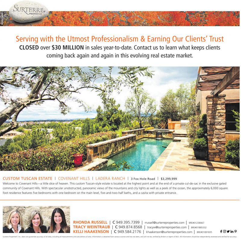 Serving with the Utmost Professionalism & Earning Our Clients’ Trust CLOSED over $30 MILLION in sales year-to-date. Contact us to learn what keeps clients coming back again and again in this evolving real estate market. CUSTOM TUSCAN ESTATE | COVENANT HILLS | LADERA RANCH | 3 Fox Hole Road | $3,299,999 Welcome to Covenant Hills—a little slice of heaven. This custom Tuscan-style estate is located at the highest point and at the end of a private cul-de-sac in the exclusive gated community of Covenant Hills. With spectacular unobstructed, panoramic views of the mountains and city lights as well as a peek of the ocean, the approximately 6,000 square foot residence features five bedrooms with one bedroom on the main level, five-and-two-half baths, and a casita with private entrance. RHONDA RUSSELL | C 949.395.7399 | rrussell@surterreproperties.com | BRE#01238067 TRACY WEINTRAUB | C 949.874.8568 | tracyw@surterreproperties.com | BRE#01885332 KELLI HAAKENSON | C 949.584.2176 | khaakenson@surterreproperties.com | BRE#01891835 Surterre Properties ® ,Inc. does not guarantee accuracy ofall data, including all measurements and calculations ofarea. Information is obtained from various sources and has not been, and will not be, verified by Broker or Agent ofMLS. All information should be independently reviewed and verified for accuracy.