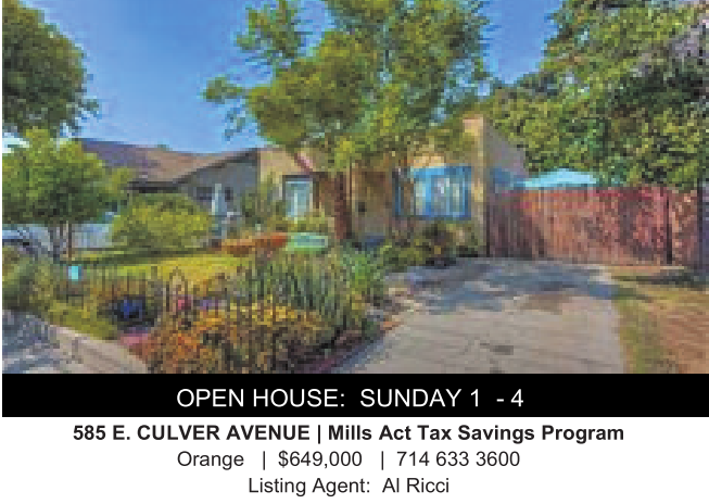 585 E. CULVER AVENUE |Mills Act Tax Savings Program Orange | $649,000 | 714 633 3600 Listing Agent: AlRicci