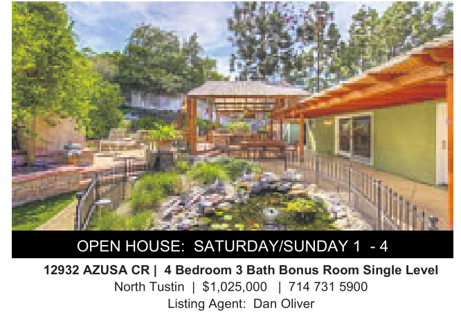 OPEN HOUSE: SATURDAY/SUNDAY 1 - 4 12932 AZUSA CR| 4Bedroom 3Bath Bonus Room Single Level North Tustin | $1,025,000 | 714 731 5900 Listing Agent: Dan Oliver