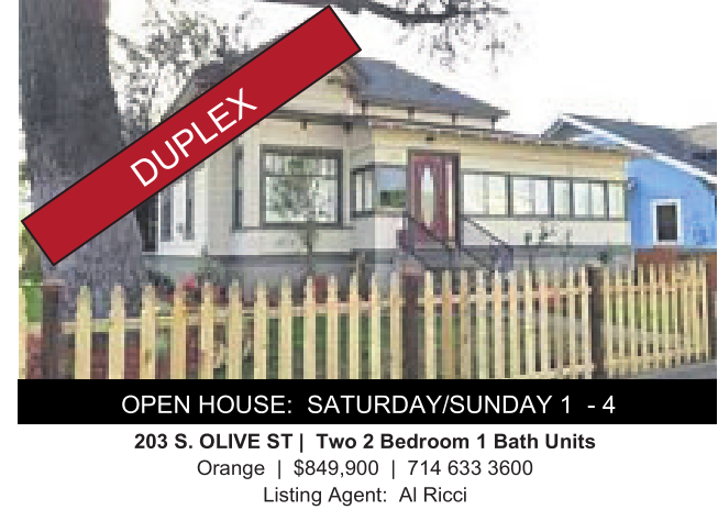 OPEN HOUSE: SATURDAY/SUNDAY 1 - 4 203 S. OLIVE ST| Two 2Bedroom 1Bath Units Orange | $849,900 | 714 633 3600 Listing Agent: AlRicci