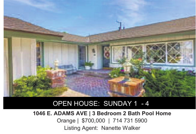 1046 E.ADAMS AVE |3Bedroom 2 Bath Pool Home Orange | $700,000 | 714 731 5900 Listing Agent: Nanette Walker