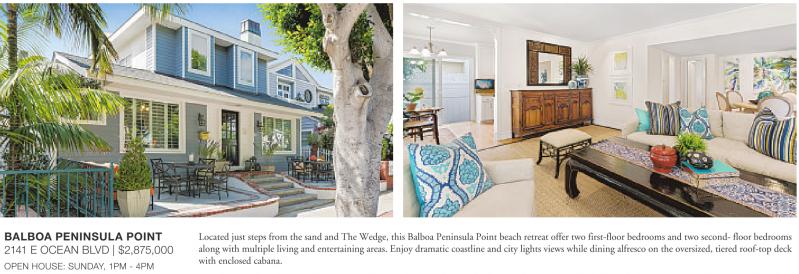 BALBOA PENINSULA POINT 2141 E OCEAN BLVD | $2,875,000 OPEN HOUSE: SUNDAY, 1PM - 4PM Located just steps from the sand and The Wedge, this Balboa Peninsula Point beach retreat offer two first-floor bedrooms and two second- floor bedrooms along with multiple living and entertaining areas. Enjoy dramatic coastline and city lights views while dining alfresco on the oversized, tiered roof-top deck with enclosed cabana.