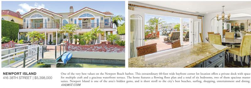 NEWPORT ISLAND 416 38TH STREET | $5,398,000 One of the very best values on the Newport Beach harbor. This extraordinary 60-foot wide bayfront corner lot location offers a private dock with space for multiple craft and a gracious waterfront terrace. The home features a flowing floor plan and a total of six bedrooms, two of them spacious master suites. Newport Island is one of the area’s hidden gems, and is short stroll to the city’s best beaches, surfing, shopping, entertainment and dining. 41638ST.COM