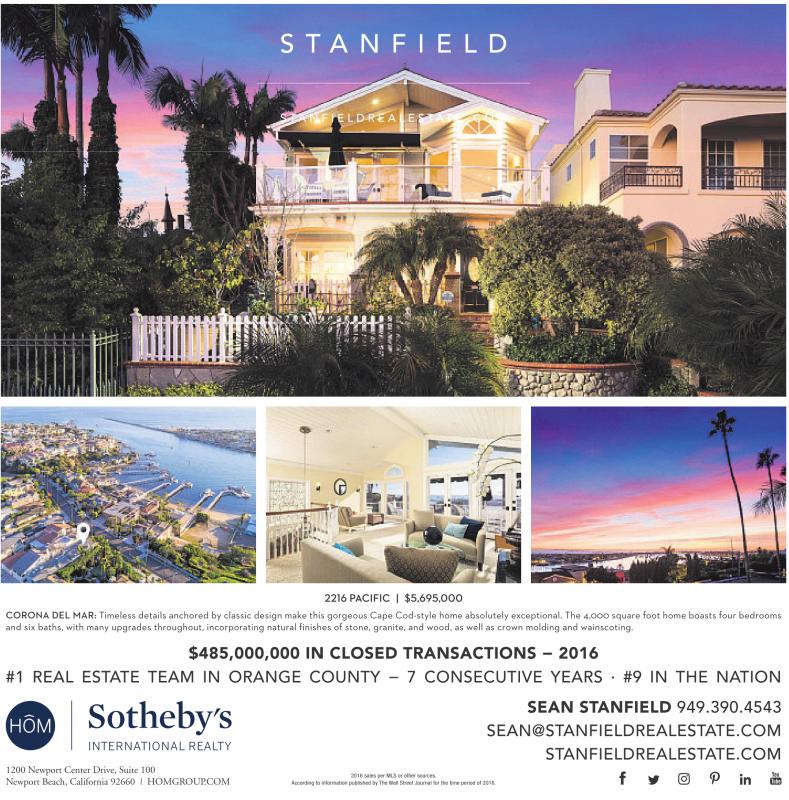 2216 PACIFIC | $5,695,000 CORONA DEL MAR: Timeless details anchored by classic design make this gorgeous Cape Cod-style home absolutely exceptional. The 4,000 square foot home boasts four bedrooms and six baths, with many upgrades throughout, incorporating natural finishes of stone, granite, and wood, as well as crown molding and wainscoting. $485,000,000 IN CLOSED TRANSACTIONS 2016 #1 REAL ESTATE TEAM IN ORANGE COUNTY 7 CONSECUTIVE YEARS · #9 IN THE NATION 1200 Newport Center Drive, Suite 100 Newport Beach, California 92660 | HOMGROUP.COM 2016 sales per MLS or other sources. According to information published by The Wall Street Journal for the time period of2016. SEAN STANFIELD 949.390.4543 SEAN@STANFIELDREALESTATE.COM STANFIELDREALESTATE.COM