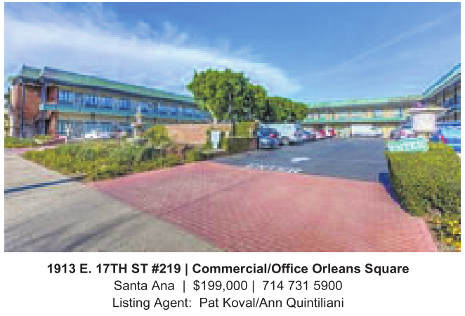 1913 E.17TH ST#219 |Commercial/Office Orleans Square Santa Ana | $199,000 | 714 731 5900 Listing Agent: Pat Koval/Ann Quintiliani