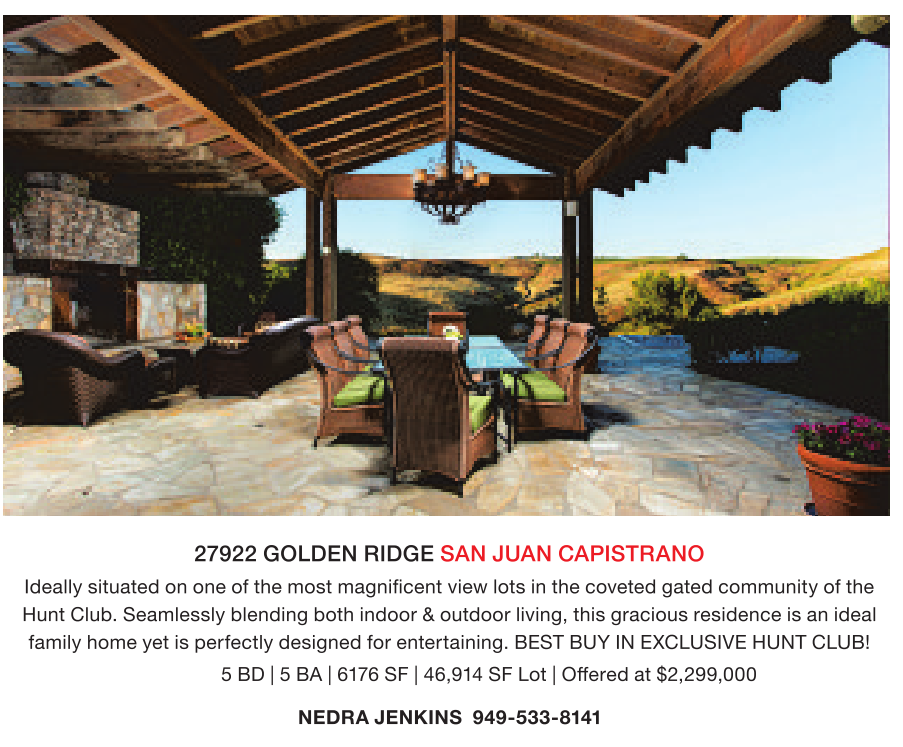 27922 GOLDEN RIDGE SAN JUAN CAPISTRANO Ideally situated on one ofthe most magnificent view lots inthe coveted gated community ofthe Hunt Club. Seamlessly blending both indoor &outdoor living, this gracious residence is an ideal family home yet is perfectly designed for entertaining. BEST BUY INEXCLUSIVE HUNT CLUB!