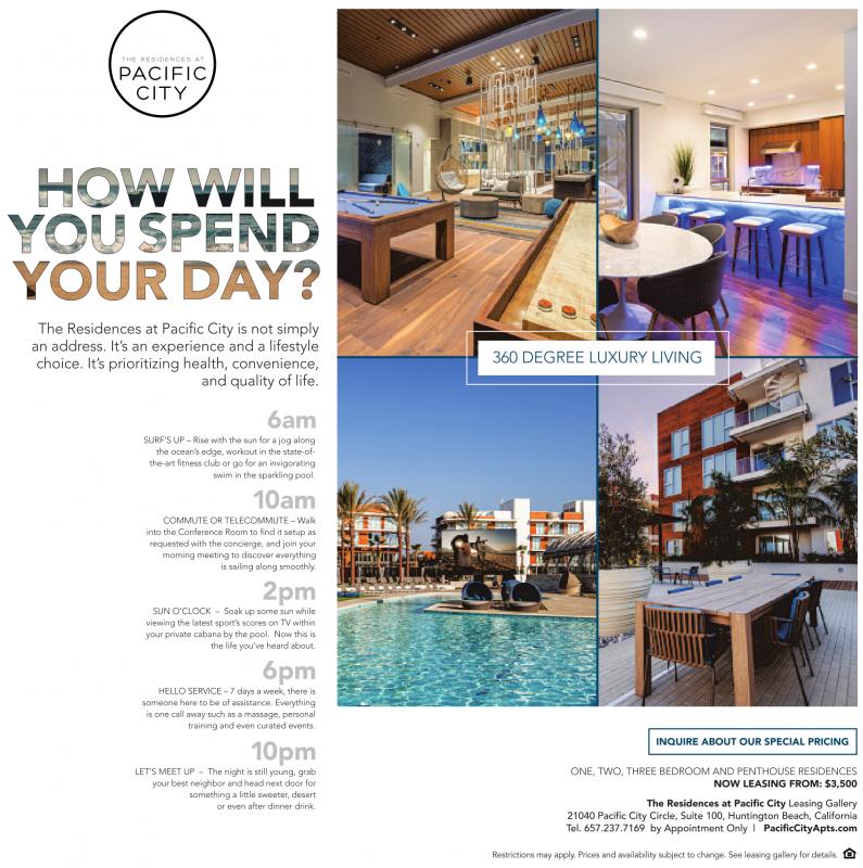 ONE, TWO, THREE BEDROOM AND PENTHOUSE RESIDENCES NOW LEASING FROM: $3,500 The Residences at Pacific City Leasing Gallery 21040 Pacific City Circle, Suite 100, Huntington Beach, California Tel. 657.237.7169 by Appointment Only | PacificCityApts.com