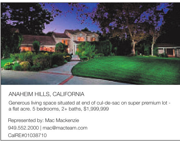 ANAHEIM HILLS, CALIFORNIA Generous living space situated at end of cul-de-sac on super premium lot - aflat acre. 5bedrooms, 2+ baths, $1,999,999
